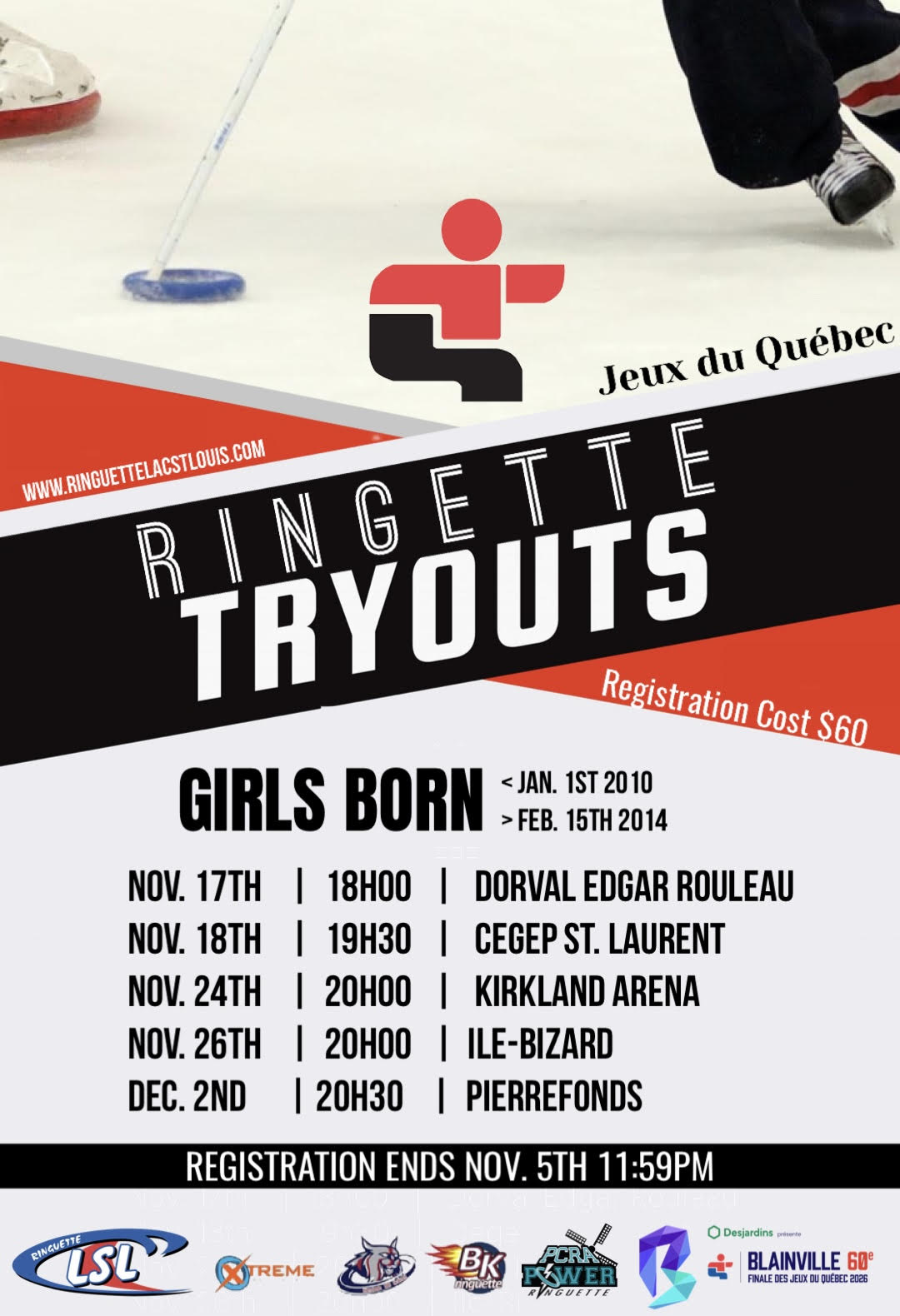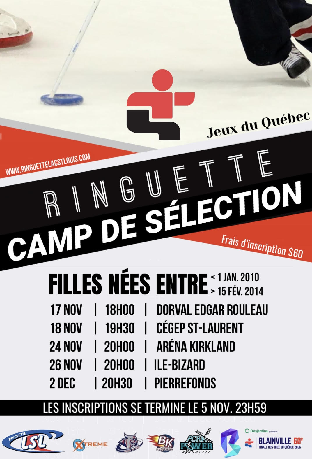 | Paiement Camp de sélection Veuillez envoyer votre virement bancaire de 60$ au treasurer@ringuettelacstlouis.com afin de confirmer l’inscription de votre fille. N’oubliez pas d’écrire le nom de votre fille dans les notes. |